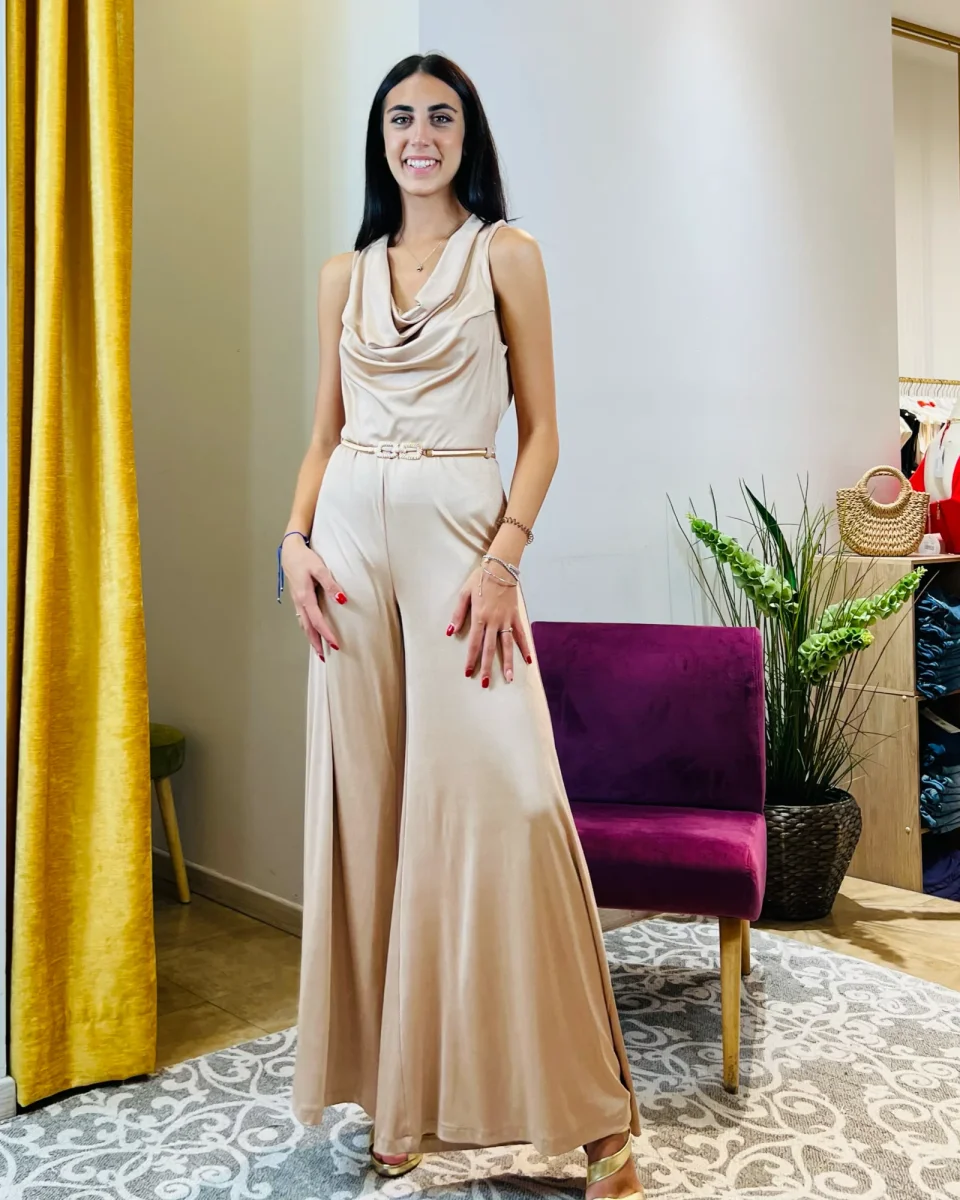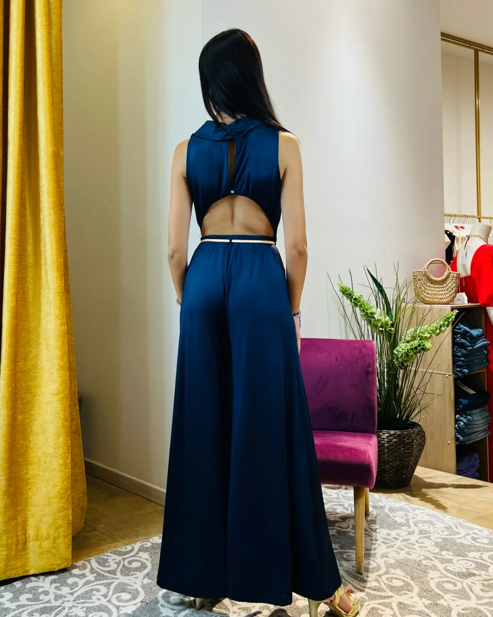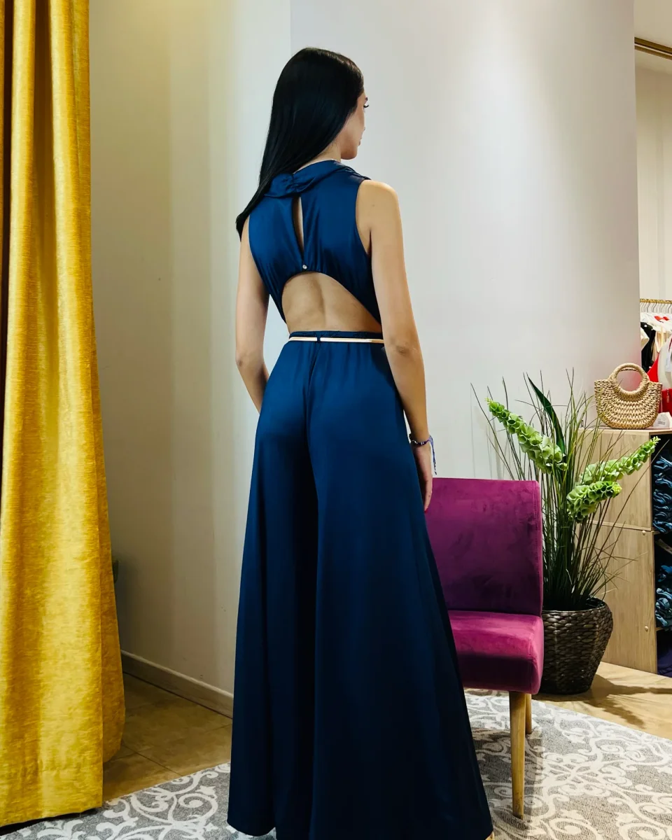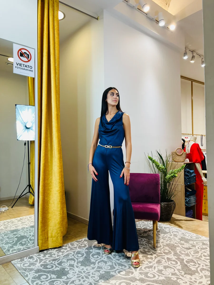 Tuta “Midnight Azure”. Tuta elegante con pantaloni palazzo in jersey.