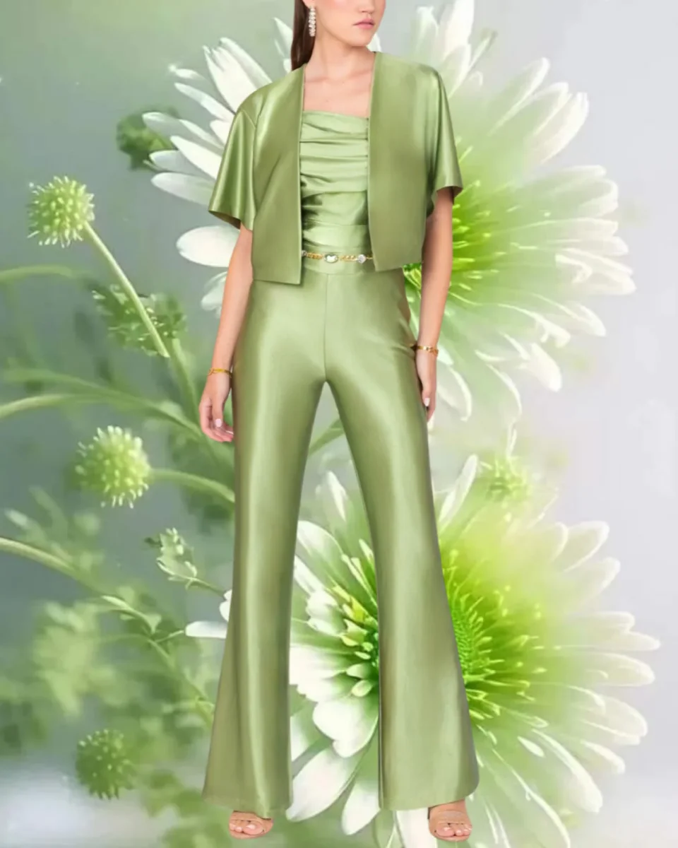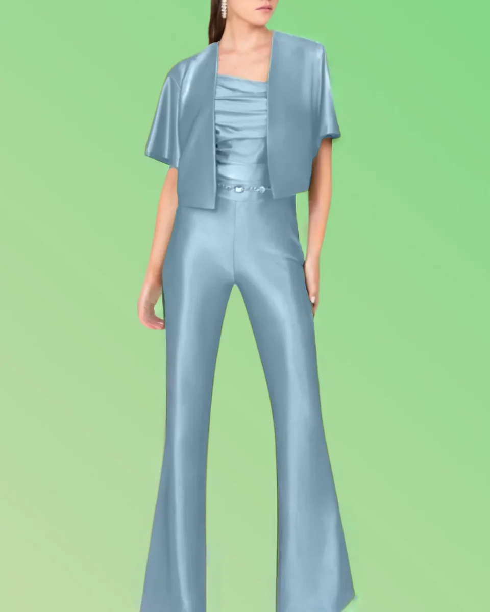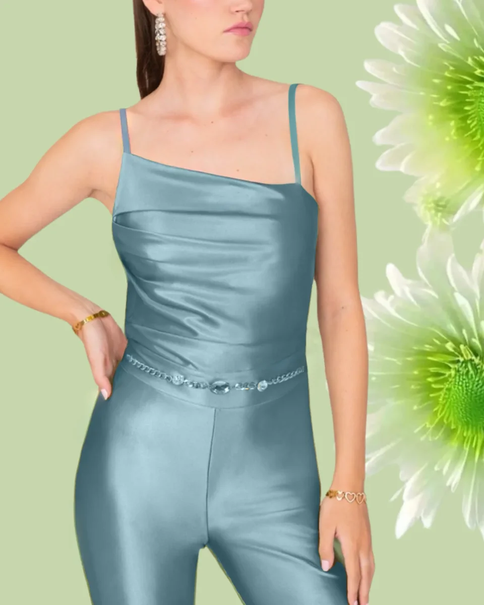 Tuta “Twilight Sheen”. Tuta elegante con top e pantaloni zampa, tessuto brillante azzurro metallizzato