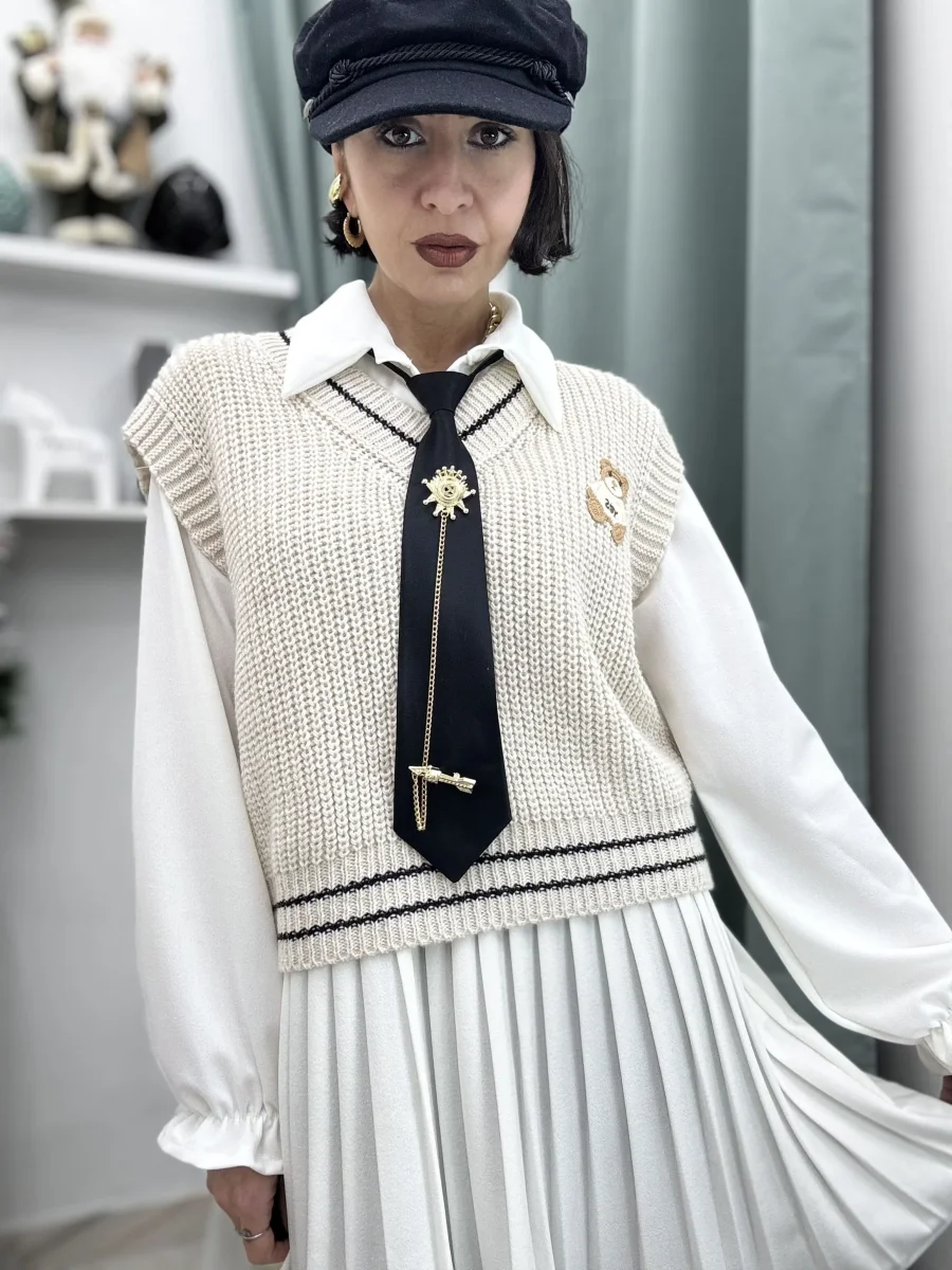 Originale e di grande carattere, questo vestito corto elasticizzato a camicia รจ un capo dal design ricercato, perfetto per chi ama distinguersi con stile. Il modello รจ arricchito da un gilet coordinato applicato sopra, impreziosito da un piccolo pupazzo ricamato, dettaglio unico e ironico che rende lโabito speciale. Completa il look una cravatta nera regolabile, […]