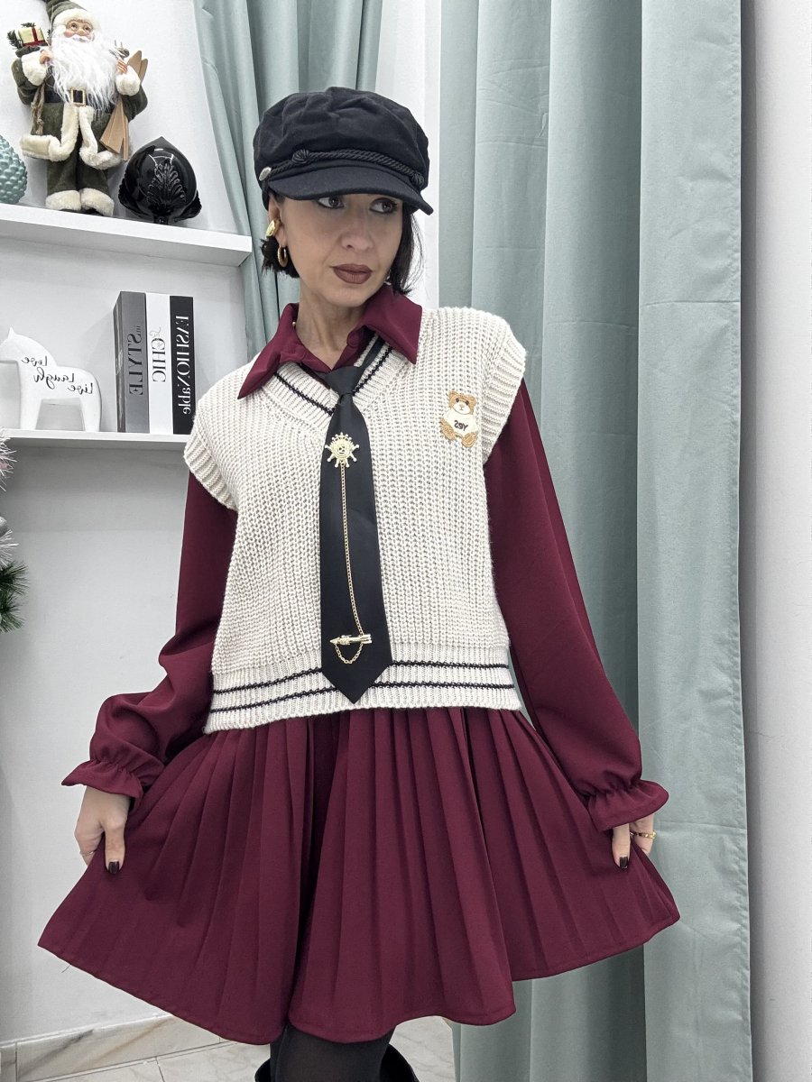 Vestito corto elasticizzato a camicia con gilet e cravatta