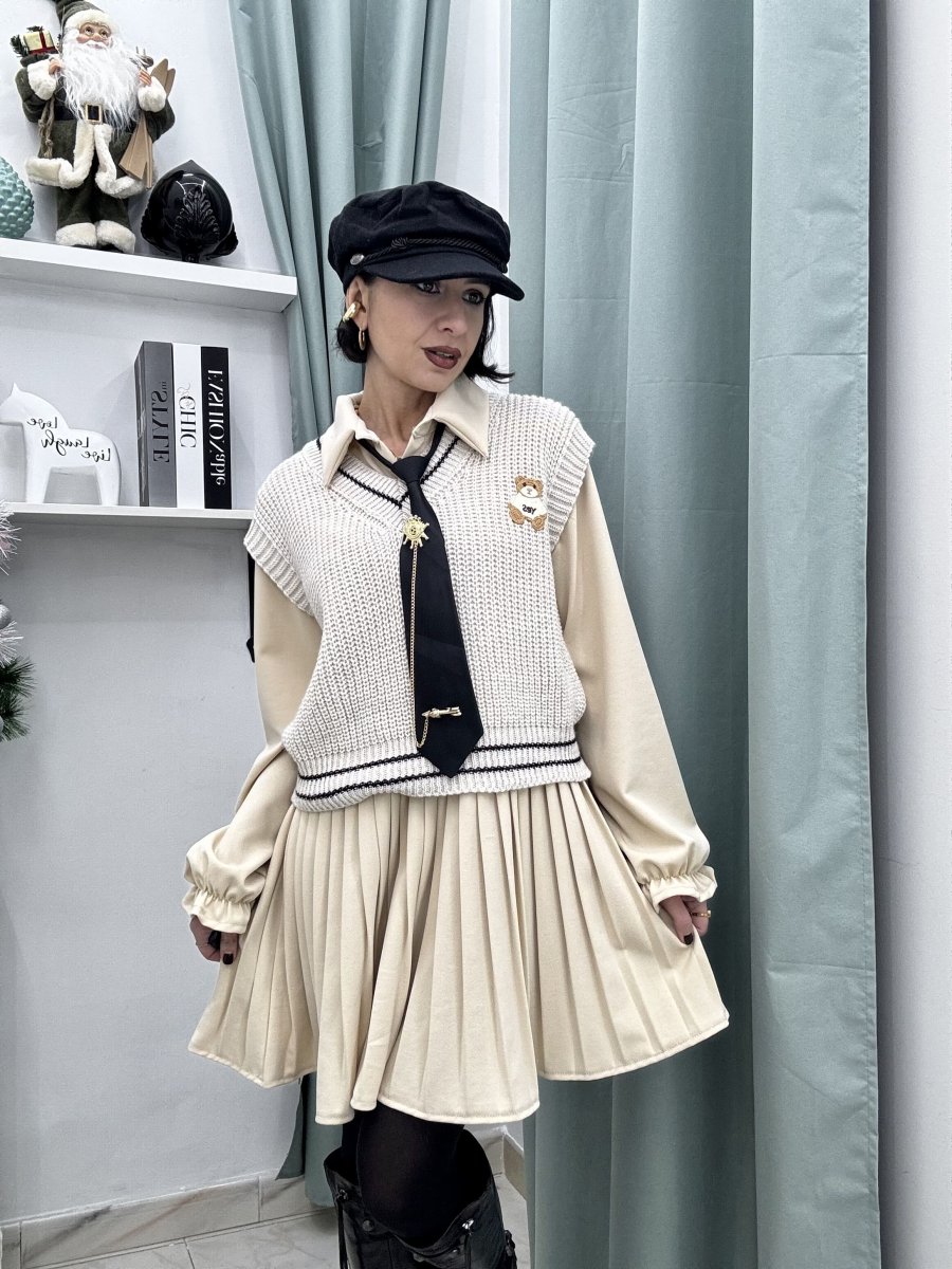 Originale e di grande carattere, questo vestito corto elasticizzato a camicia รจ un capo dal design ricercato, perfetto per chi ama distinguersi con stile. Il modello รจ arricchito da un gilet coordinato applicato sopra, impreziosito da un piccolo pupazzo ricamato, dettaglio unico e ironico che rende lโabito speciale.